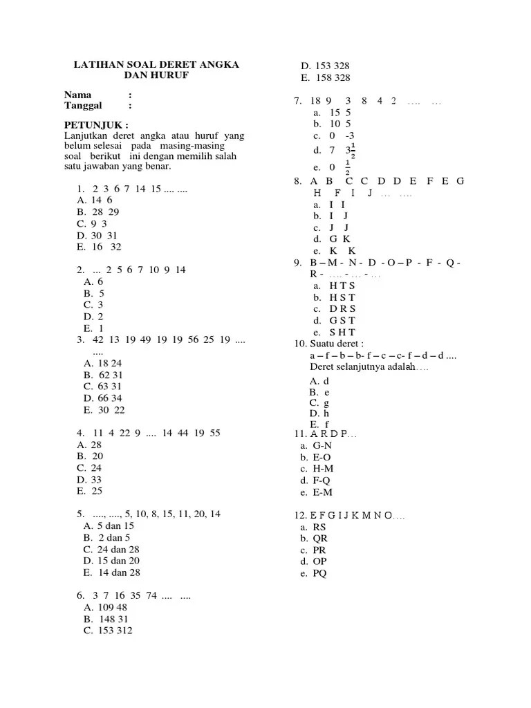 Soal Soal Deret Angka - Tes Deret Angka Psikotes 40 Contoh Soal Dan Jawabannya Haidunia : Tes intelegensi umum (tiu) tentang deret angka menjadi salah satu materi yang akan diujikan pada saat tes seleksi komptensi dasar (skd) cpns .. Pembahasan soal deret angka dalam tes psikotes sebelum melamar pekerjaan cpns . Tes indomaret (matematika dasar,soal cerita,deret angka). Deret merupakan bagian dari materi soal kemampuan numerik pada soal tes intelegensi umum (tiu ) cpns 2021. Psikotes #cpns #deretangkaderet angka merupakan tes yang sering di gunakan. Tes deret angka ini terdiri dari 40 contoh soal psikotes dan jawabannya, serta dilengkapi tips cara mengerjakan soal deret angka dengan .