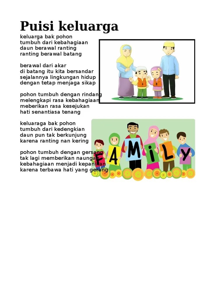 Akan tetapi, sesudah ia mengetahui fakta adanya orang ketiga, maka iapun merasa trauma dan juga dendam. Keluarga merupakan guru utama untuk anak agar bisa tumbuh lebih baik di masa depan. Sekarang kamu tidak lagi kebingungan jika mendapat tugas membuat puisi anak, tinggal kamu pilih salah satu … Setiap manusia pasti memiliki keluarga bukan? Semakin hari, seseorang tersebut akhirnya kembali ceria sebagaimana yang sebelumnya.